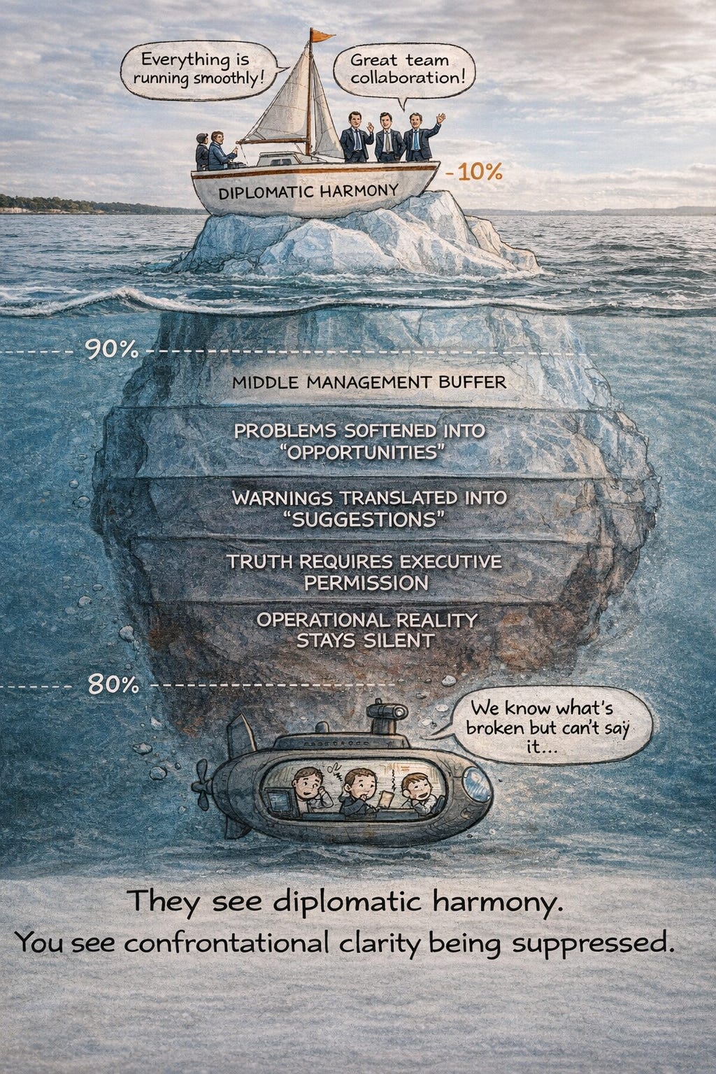 Why? Because confrontational clarity exposes that they’ve been translating problems into diplomatic language that prevents action. They’ve been the buffer that keeps uncomfortable truths from reaching decision-makers.